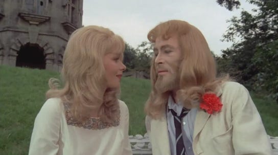 You know what Jesus loved doing? Being poor. That’s why Jack wants to give away all his family’s fortune. This doesn’t sit well with Jack’s uncle, Sir Charles (William Mervyn), who seeks to wrest control of that fortune away from Jack. Sir Charles tricks Jack into a relationship with Grace (Carolyn Seymour), intending to have Jack committed to an institution the moment he produces a male heir.